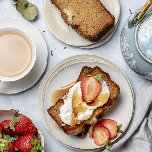 The banana bread can be served with whipped ricotta and extra maple syrup as a lovely brunch or a perfect lunchbox treat.